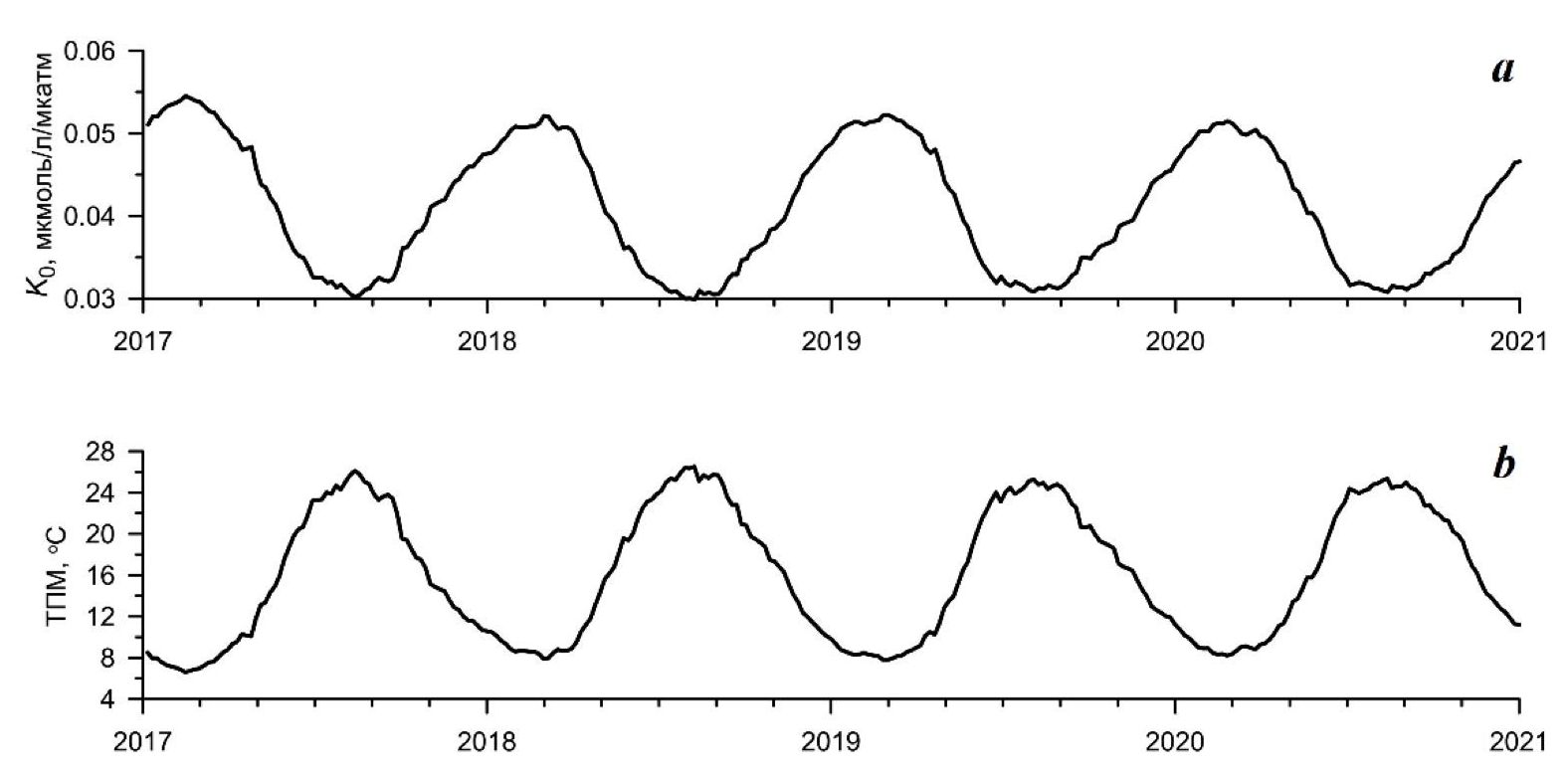 На рис. 2, а представлен график зависимости от времени среднего по площади моря значения коэффициента Генри. При расчете значения коэффициента в каждой точке сетки использовались поля температуры и солености, полученные в реанализе гидродинамических полей Черного моря. Изменчивость коэффициента Генри также носит выраженный сезонный характер и находится почти в противофазе с изменением парциального давления углекислого газа (см. рис. 1, b). В течение года среднее по площади значение коэффициента Генри меняется почти в два раза. На рис. 2, b представлен график изменения поверхностной температуры моря. Эти два графика меняются в противофазе, и можно сделать вывод, что изменение среднего по площади моря значения коэффициента Генри определяется главным образом температурой морской воды. То есть основной вклад во внутригодовую изменчивость парциального давления CO2 в поверхностном слое моря вносят гидрологические факторы (в основном температура воды). При понижении температуры воды парциальное давление уменьшается, а при увеличении температуры – растет. Соответственно, пока давление растворенного CO2 больше атмосферного, поток через поверхность моря направлен в атмосферу, что сопровождается уменьшением концентрации растворенного CO2, затем, когда давление растворенного газа становится меньше атмосферного, поток через поверхность меняет направление, при этом увеличивается концентрация растворенного углекислого газа.