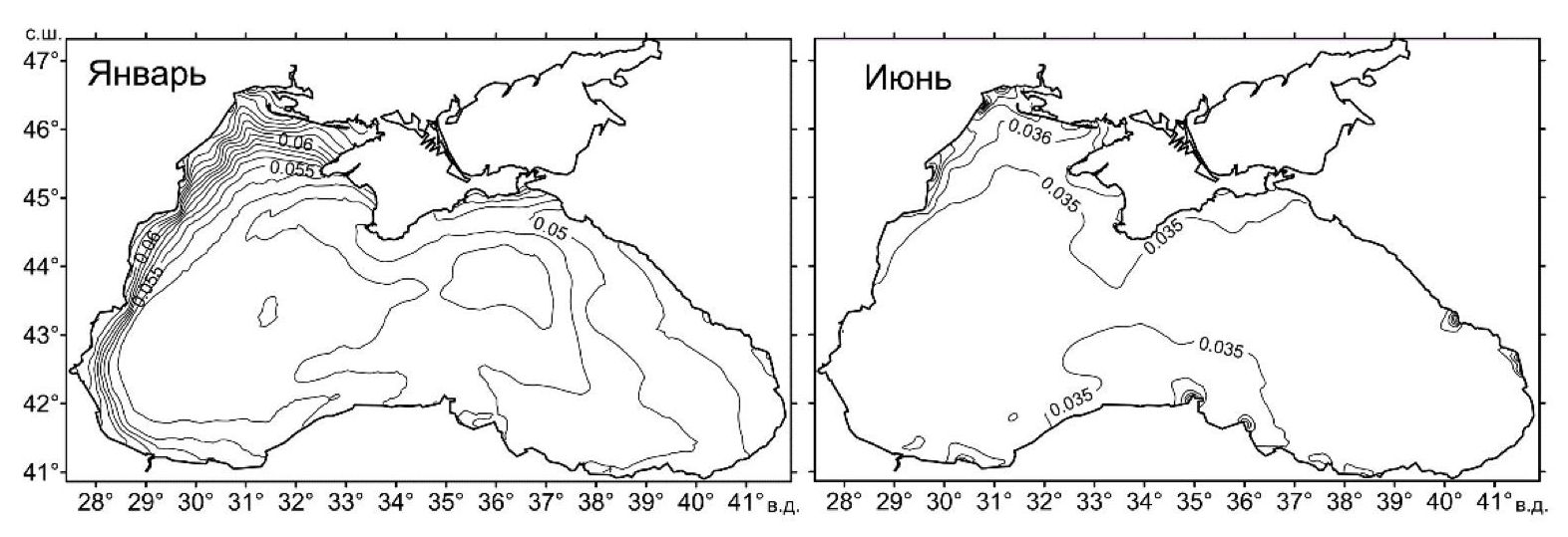 На рис. 3 представлено пространственное распределение коэффициента Генри. Летом распределение коэффициента Генри почти равномерно по всей акватории за исключением мест впадения рек, где вода сильно распреснена. Зимой значение коэффициента выше летнего. Кроме того, хорошо видно повышение значений коэффициента на северо-западном шельфе (СЗШ) и вдоль западного берега Черного моря. Это вызвано тем, что на СЗШ зимой самая холодная и распресненная вода. А интенсивное в зимнее время Основное Черноморское течение переносит эту воду вдоль западного берега.