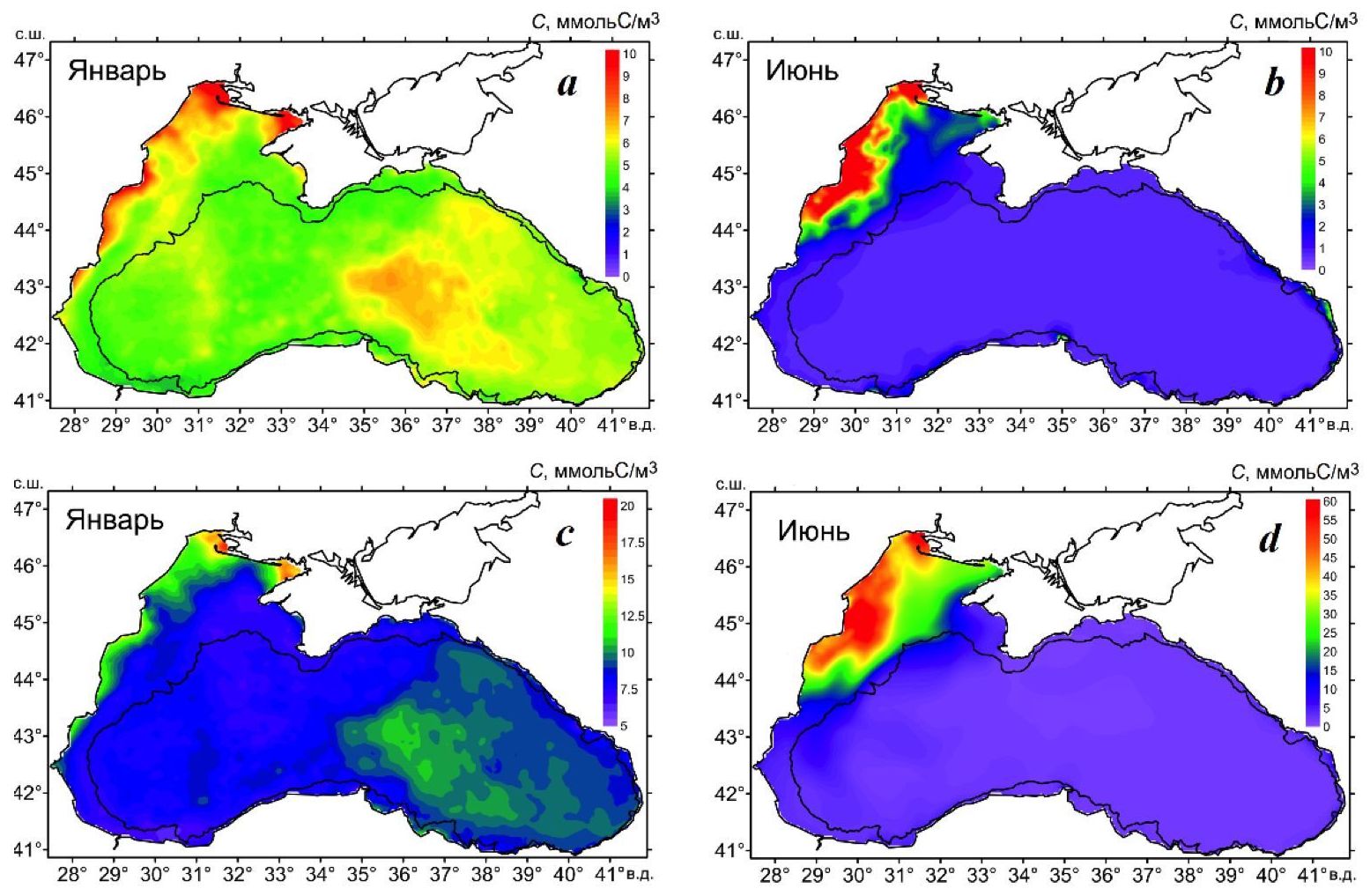 В январе поверхностная концентрация фитопланктона достаточно велика по всей акватории Черного моря (рис. 5, a), в том числе и в глубоководной части. Суммарная концентрация всего планктона также имеет высокие значения (рис. 5, c), но в основном за счет фитопланктона. Соответственно на рис. 5, c преобладает поглощение углекислого газа в процессе фотосинтеза.