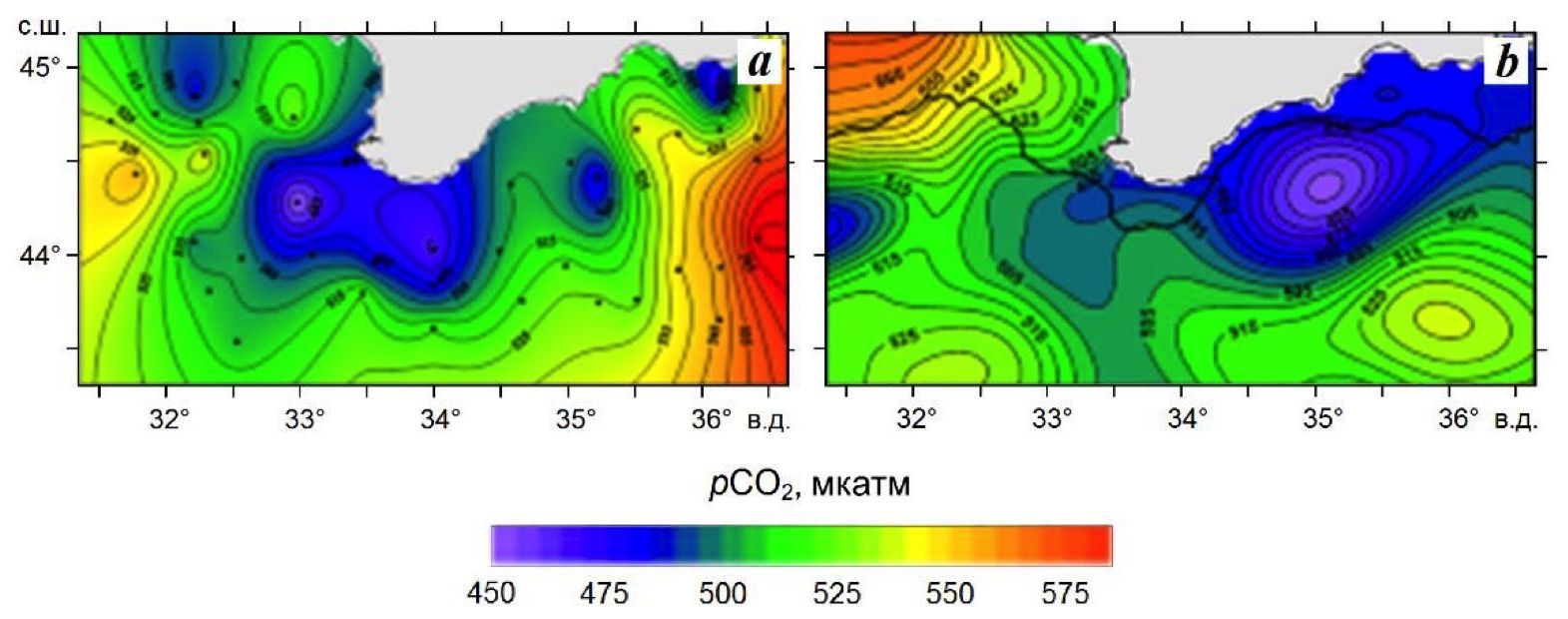 Рис. 6. Карты распределения pCO2, построенные по данным наблюдений (a) и результатам численного моделирования (b)