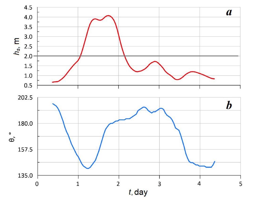 The second (S2) (Fig. 4) and third (S3) (Fig. 5) storm situations commenced on 26 January 1988 and 25 September 2017, respectively. The storms in question were caused by the occurrence of intense prolonged low-moving anticyclonic anomalies characterised by winds originating from the east-southeast (112.5°). Storm S2, having the maximum value of the SPI power index equal to 660 m2×h, is characterised by the following parameter values for the active phase: hs = 2.9 m; tp = 9.4 s; T = 72 h. Storm S3 exhibited the longest active phase duration of all identified storms, spanning a total of 95 h, the power index was 625 m2×h, with a mean significant wave height of 2.6 m.