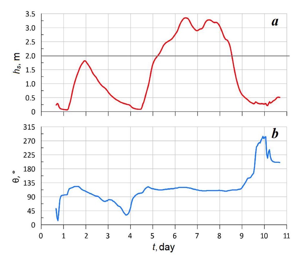 Fig. 5. Significant wave heights (a) and mean wave direction (b) in the central part of Koktebel Bay for storm (S3) which is extreme by duration (T = 95 hours, hs = 2.6 m, SPI = 625 m2×h) according to SWAN-ERA data
