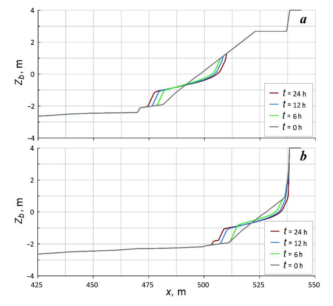 Tables 2, 3 present the results of the LC and LS parameter calculations. The data indicate that the most significant changes in LC and LS occur during the initial six hours of a storm. Therefore, the rate of shoreline retreat can reach 3.9–5.3 m even in a relatively brief storm. Following a period of storm activity lasting 24 hours, the LC values for the S1 storm were observed to range between 6.4 and 8.3 m, while those for the S2 storm ranged between 6.1 and 6.7 m. At the end of the S2 storm (t = 72 h), the LC values attained a maximum range of 9.1–10.0 m. The extent of the underwater erosion zones is three times greater than that of the erosion zones of the above-water part of the beach for all profile types.