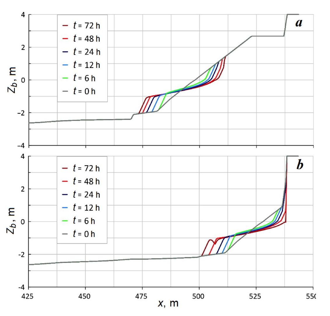 One of the modern freely available models for the study of coastal zone reshaping by hydrodynamic processes is the two-dimensional XBeach (eXtreme Beach behavior) model 2) [4, 5]. Regional modeling studies of coastal zone dynamics