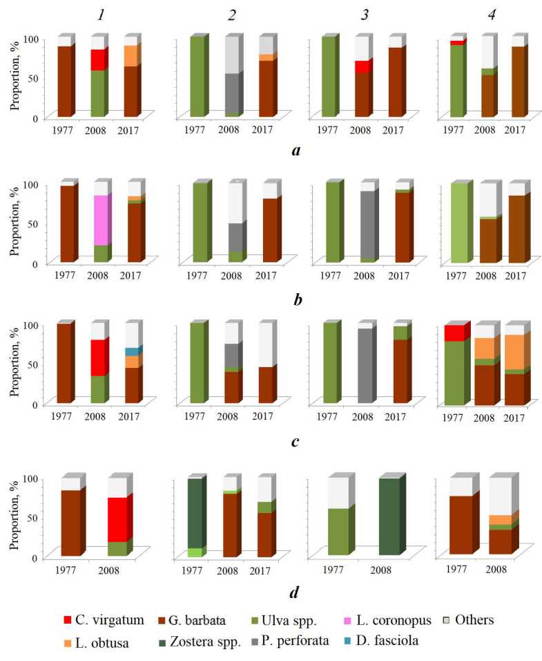 A comparative analysis of spatiоtemporal changes in the contribution of dominant macrophyte species in the western part of Sevastopol Bay over a 40-year period was performed.