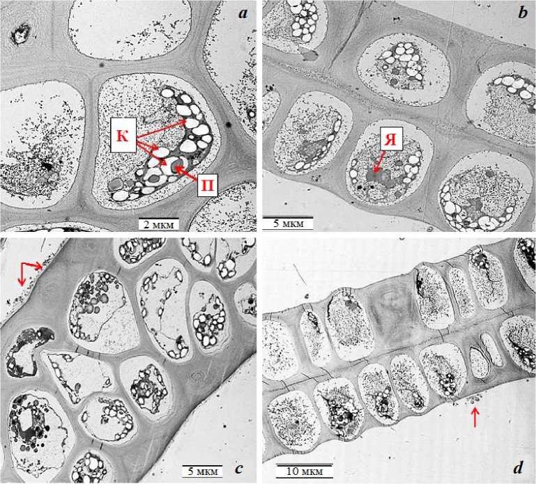 Light-optical and electron-microscopic observations revealed that the thalli of U. lactuca, collected from a habitat where the PP concentration was 0.62 mg/L (12 MPC), exhibited no significant differences in cell ultrastructure when compared to previously studied thalli of ulva algae inhabiting waters with PP content ranging from 0.1–0.2 mg/L (2–4 MPC) observed in most of the studied bays of the Kola Bay and Eastern Murman coasts of the Barents Sea. All selected thalli were viable under control conditions until the conclusion of the experiment. No destructive changes in cell morphology were observed. Chloroplasts contained single-channel pyrenoids (letter P in Fig. 1, а), predominantly immersed; a large number of starch granules were detected (letter K in Fig. 1, а), indicating that photosynthesis was well underway (Fig. 1, а).