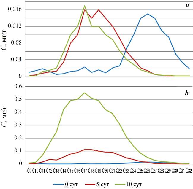 Fig. 2. Mass fraction of n-alkanes in the tissues of the Ulva lactuca during the experiment with the addition of DF: а – 10 mg/L (200 MPC); b – 20 mg/L (400 MPC)