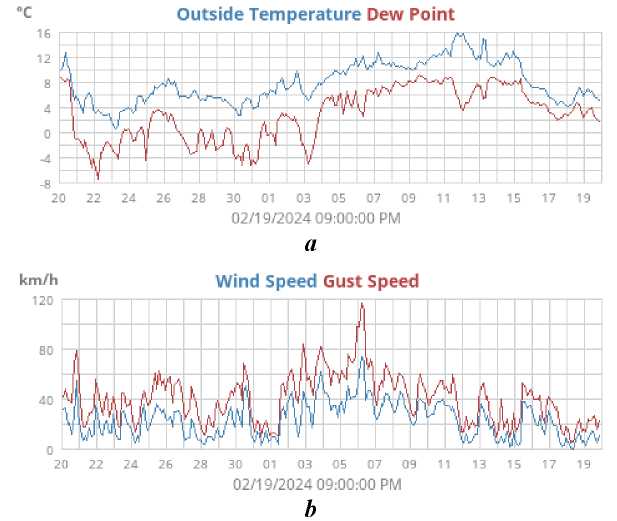 Fig. 4. Data on outside temperature (a) and wind speed (b) on the platform in Katsiveli from 20 January 2024 to 19 February 2024