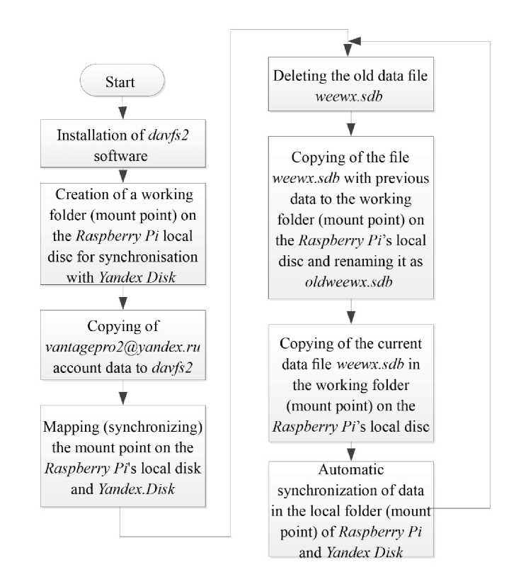 As a result of the above settings, data from the built-in sensors of the weather station Davis Vantage Pro 2 were obtained (Fig. 2). Measurement results of the Davis Vantage Pro 2 weather station during operation are continuously recorded by the WeeWX software into the weewx.sdb data file, which is stored on the local disc of the Raspberry Pi in the /var/lib/weewx/weewx.sdb folder. To process and analyse the results of measurements as well as their backup, it is advisable to copy this file from Raspberry Pi to another PC or network data storage. Fig. 3 shows the block diagram of the algorithm for connecting and saving data in the network storage.
