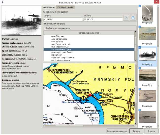 The transition from drawing to photography and film shooting with high resolution has rendered images the most durable medium for capturing the state of natural objects. When image acquisition is undertaken with sufficient accuracy in terms of place and time, a comparison of images facilitates analysis of changes in the state of objects under the influence of natural and anthropogenic factors. However, a significant proportion of images has not yet been digitised. These images are often stored in various collections and lack proper systematisation and cataloguing, which can result in their loss and limited accessibility to researchers. This situation is particularly problematic for images of seashores, including the Crimean coast. It can be remedied by organising the digitisation of images and creating special software to work with them.