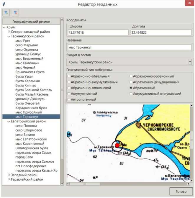 Work with the geoinformation part of the meta-information base is carried out in the geodata editor (Fig. 4), which can be used to create, delete and correct information about photosurvey regions including coordinates, name and genetic type of the coast.