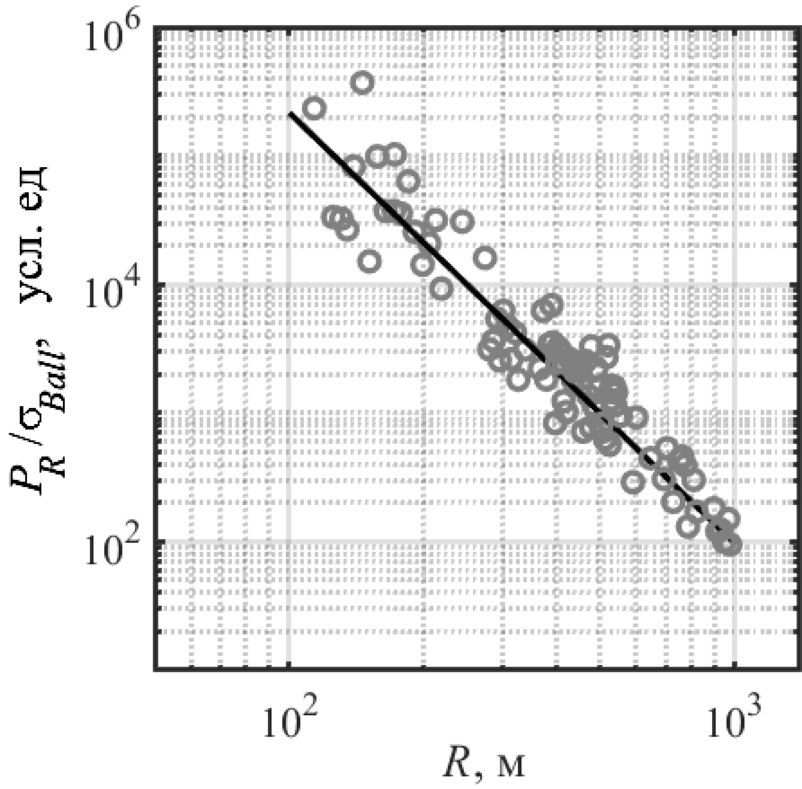 Fig. 3. Dependence of the received signal power normalized to the ball radar cross-section on the distance to the target. The straight line shows approximation by power function (1)