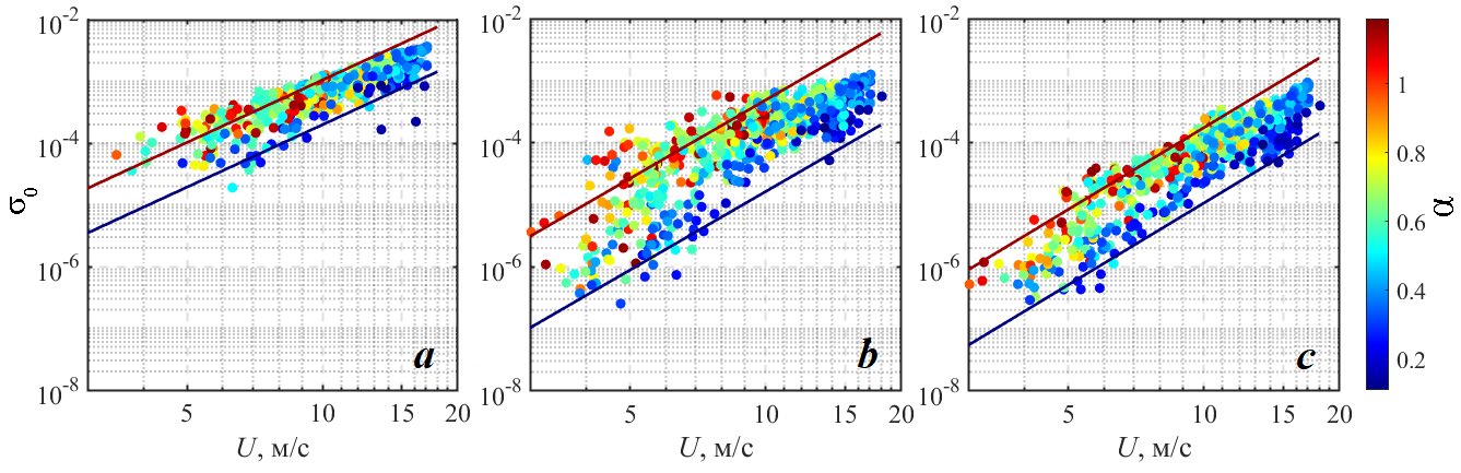 Fig. 5. NRCS of the sea surface as a function of wind speed during ‘up-wind’ (a), ‘perpendicular to the wind’ (b) and ‘down-wind’ (c) sensing. The solid lines correspond to dependence (5) with coefficients given in the table for a = 0.1 (lower line) and a = 1.2 (upper line)