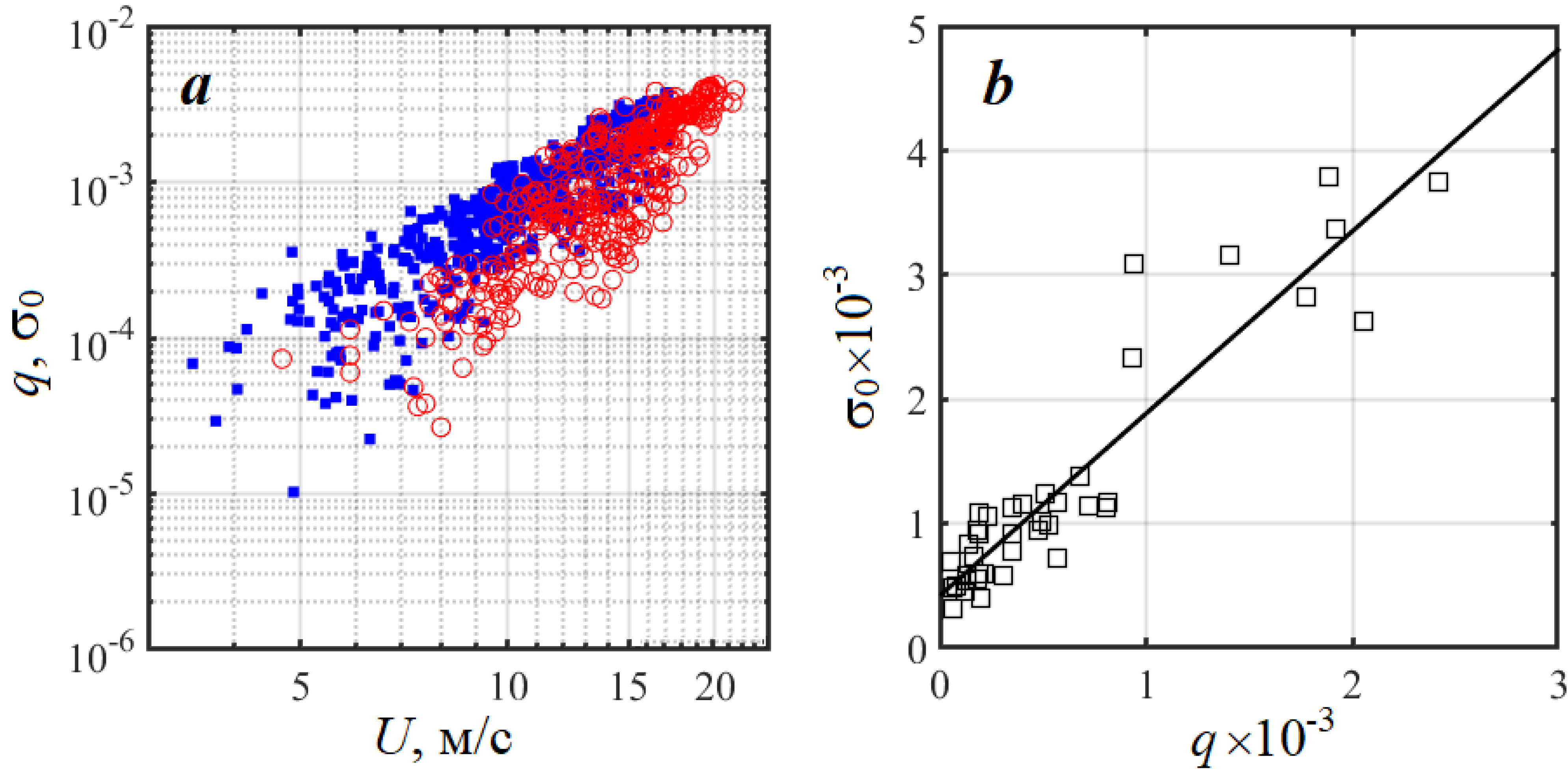 In Fig. 6, a, squares represent the values of s0up at wind speeds from 2.2 to 17.1 m/s, circles represent the values of q obtained at U = 4.7–21.4 m/s. Both wind dependencies almost coincide, but a slight difference is observed at U < 10 m/s; in these cases, a stronger decrease in the value of q is observed with decreasing wind. This can be explained by the fact that during moderate and weak winds, small breaking crests that contribute significantly to the value of q are not identified during video processing [27, 28]. At the same time, such breaking is involved in the formation of the NRCS.