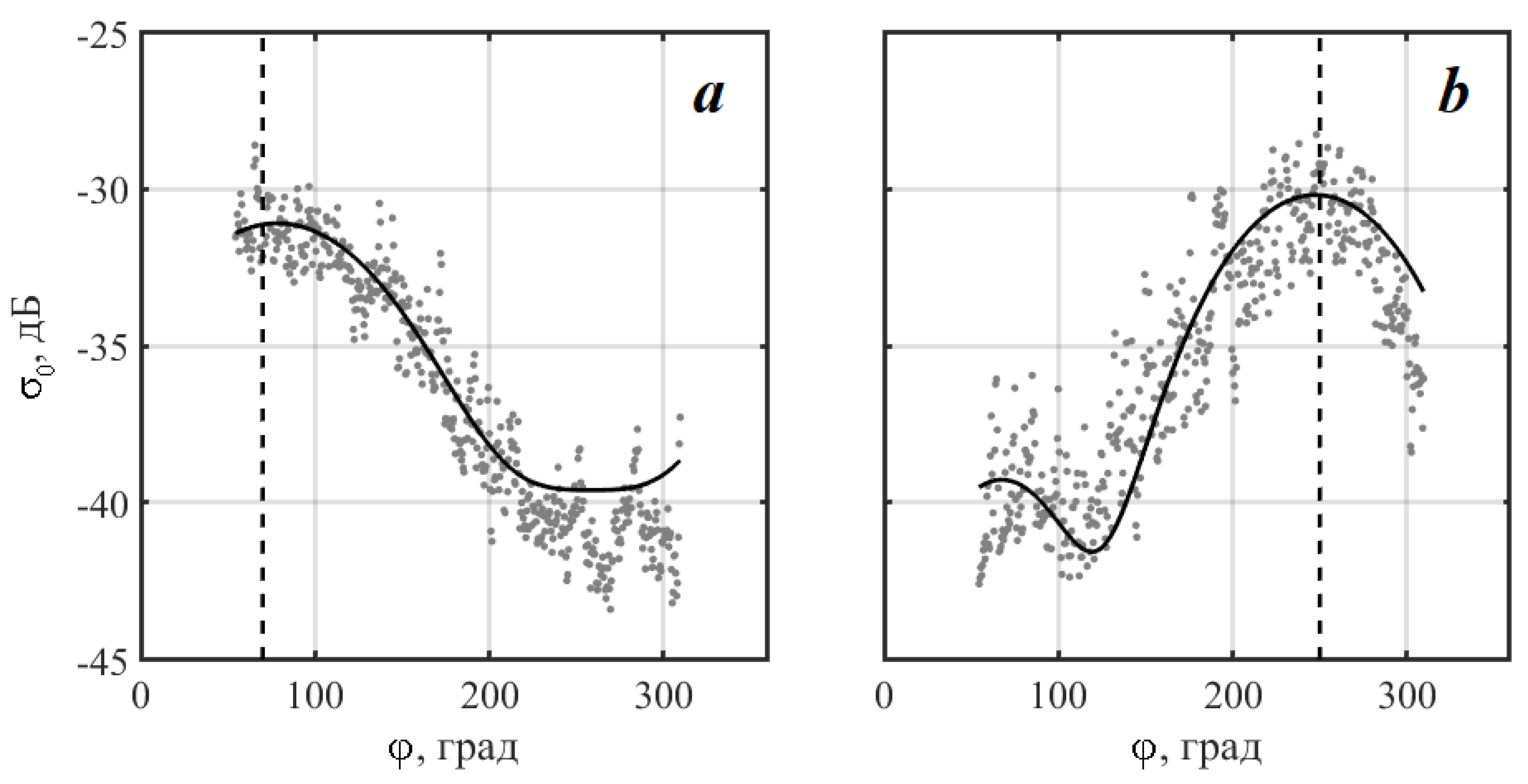 At moderate wind speeds (Fig. 7, а), azimuthal dependency s0(j) has one pronounced maximum when measuring “up-wind”, with the minimum value observed “down-wind”. When the wind speed increases (Fig. 7, b), the azimuthal dependency acquires a bimodal character, a second local maximum appears in the “up-wind” direction. The peculiarities of azimuthal dependencies at large sea surface observation angles are discussed in more detail in [20].