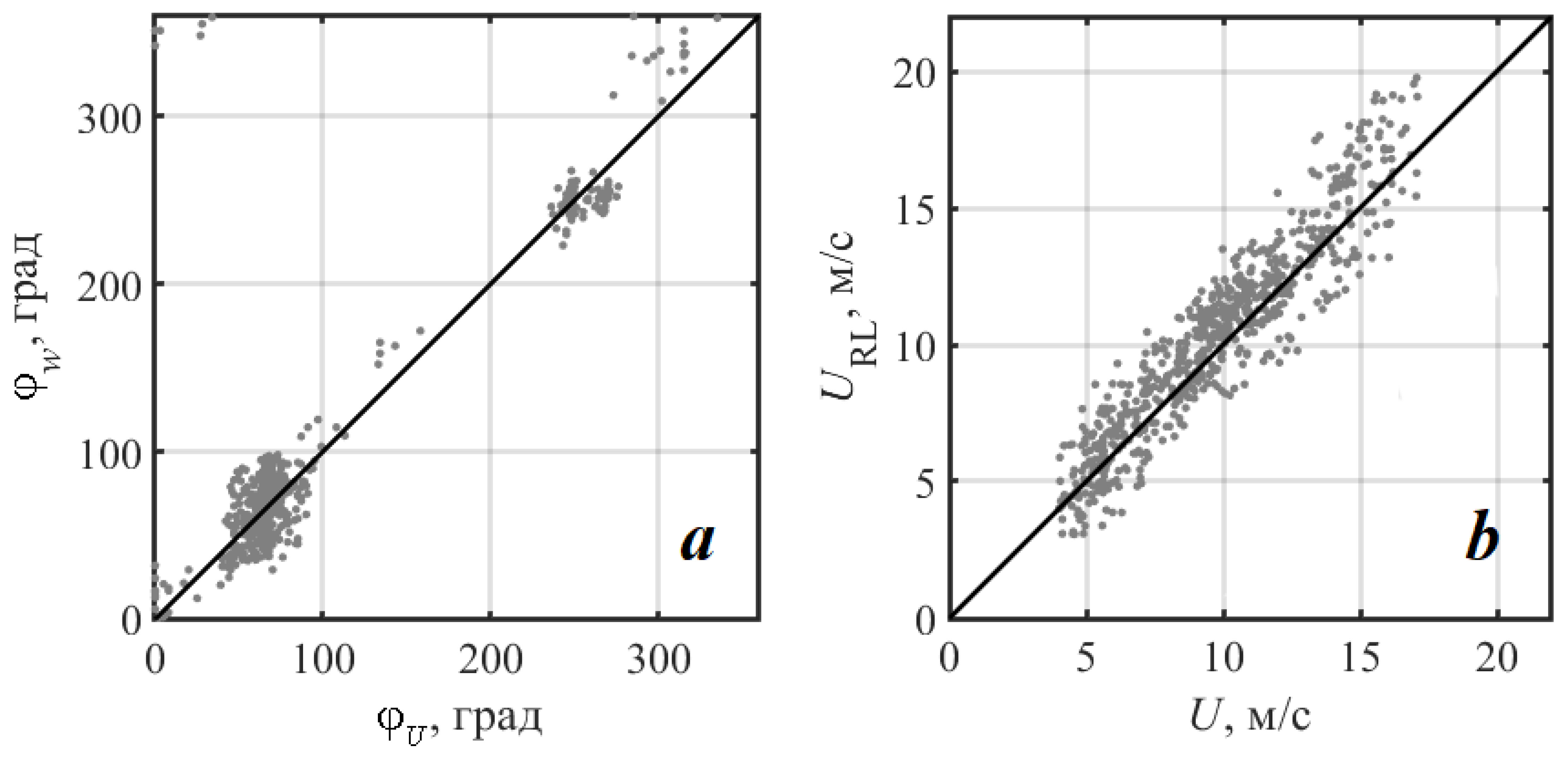 Speeds URL and jw were calculated for the whole data array by the least squares method according to formula (6) using in situ radar measurements. Fig. 8 shows the comparison of wind speed direction and vector magnitude retrieved from radar data with those retrieved from the anemometer.