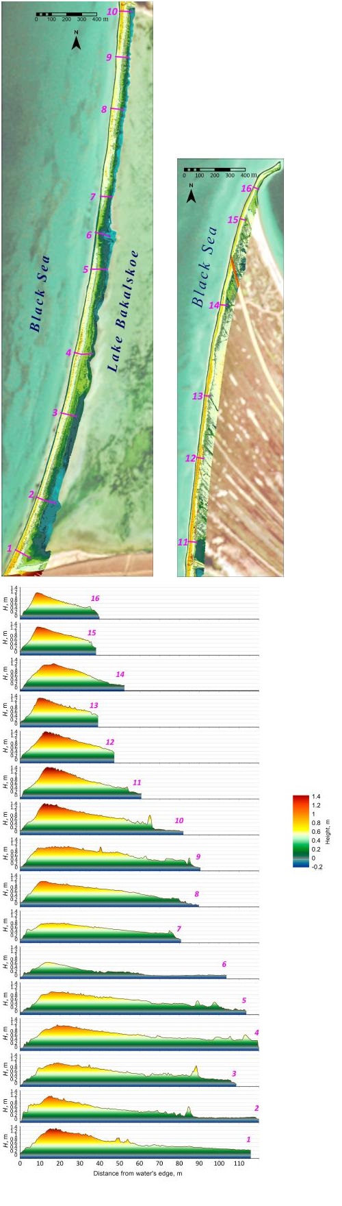 - Ridge zone. The most elevated part of the coastal bar (from 0.6 m at the Lake Bakalskoe barrier beach to 1.4 m at the root and northern parts), it is located 10–15 m from the sea’s edge (Fig. 2). The main features of the relief of this zone are formed during the strongest storms, when wave overtopping of the ridge of the coastal bar is observed along its entire length and is accompanied by the transfer of material to the rear side. During moderate storms, the wave splash crosses the ridge only through depressions in it, where seawater flowing into the inner part of the spit is concentrated and runoff troughs are formed. Between storms, runoff troughs are transformed into erosion cuts under the action of precipitation. Within the ridge zone, a more or less developed vegetation cover is present, which is destroyed during strong storms. Aeolian forms with associated vegetation have formed in places on the most elevated parts of the western branch central part.