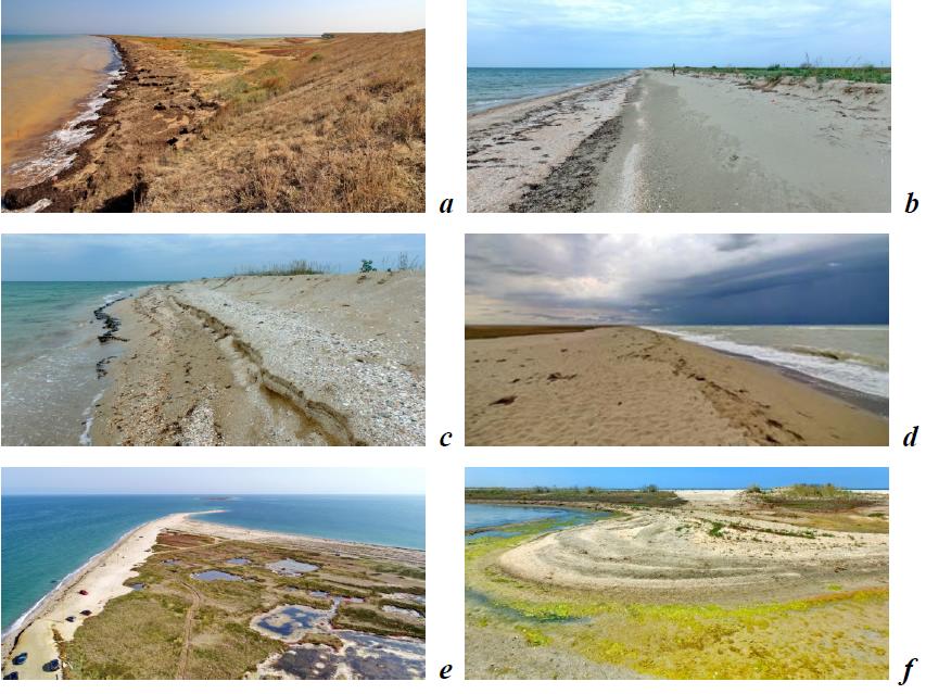 Fig. 3. The western branch of the Bakalskaya Spit: a – the root part; b – the barrier beach of Bakalskoe Lake; c – a cape formed at the sea water’s edge as a result of the exposure of vegetation remnants of the inner part of the spit; d – the beach in the central part of the spit; e – the distal part of the spit; f – the overflow cone on the shore of Bakalskoe Lake