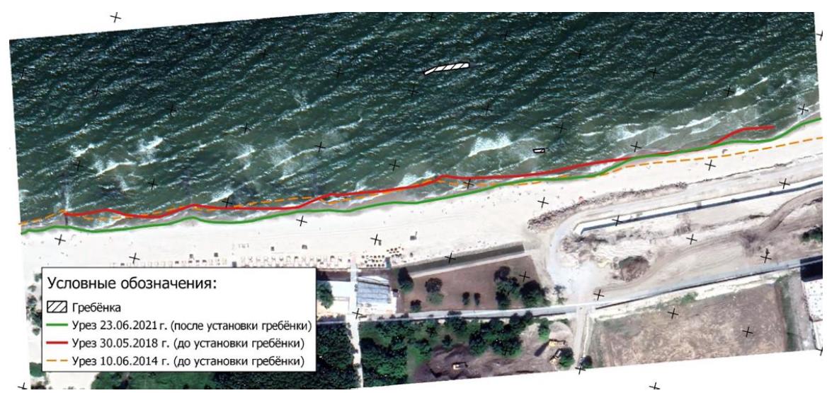 Fig. 6. Interannual dynamics of the water’s edge near the breakwater before and after its installation (2014 – GoogleEarth source, 2018 – satellite image ResursP, 2021 – GPS tracing)