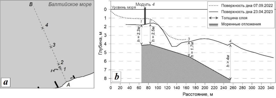 Fig. 9. The profile of the coastal slope and the loose sediment thickness: a – the layout of the profile line and points of measurement of the loose sediment thickness; b – profiles of depths and the loose sediment thickness