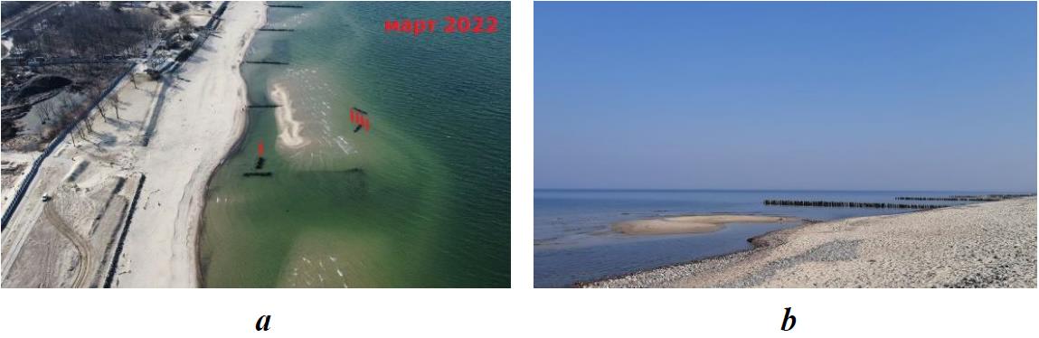 Fig. 12. Exposure of the top of the underwater alongshore bar in March 2022 shortly before its attachment to the water's edge at an extremely low sea level: a – the shore segment where the breakwater was installed (red arrows); b – the shore segment 400 m west of the breakwater installation site