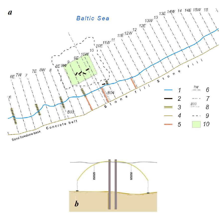 Fig. 3. Work layout: a – basic reference lines and layout of the Grebenka breakwater modules, cross sections and work areas: 1 – the water’s edge on 24.09.2022; 2 – Grebenka breakwater modules; 3 – old wooden groins; 4 – basic reference line; 5 – profiles for determining the beach width (GBU KO Baltberegozashсhita); 6 – profiles for estimating the width of the underwater bar and its distance from the water’s edge; 7 – profile for determining the loose sediment thickness; 8 – profiles for measuring the seasonal dynamics of the beach width (data from previous years were used); 9 – the boundary of the measuring range; 10 – the polygon for calculating the deformation of the underwater slope; b – inclinometer installation diagram