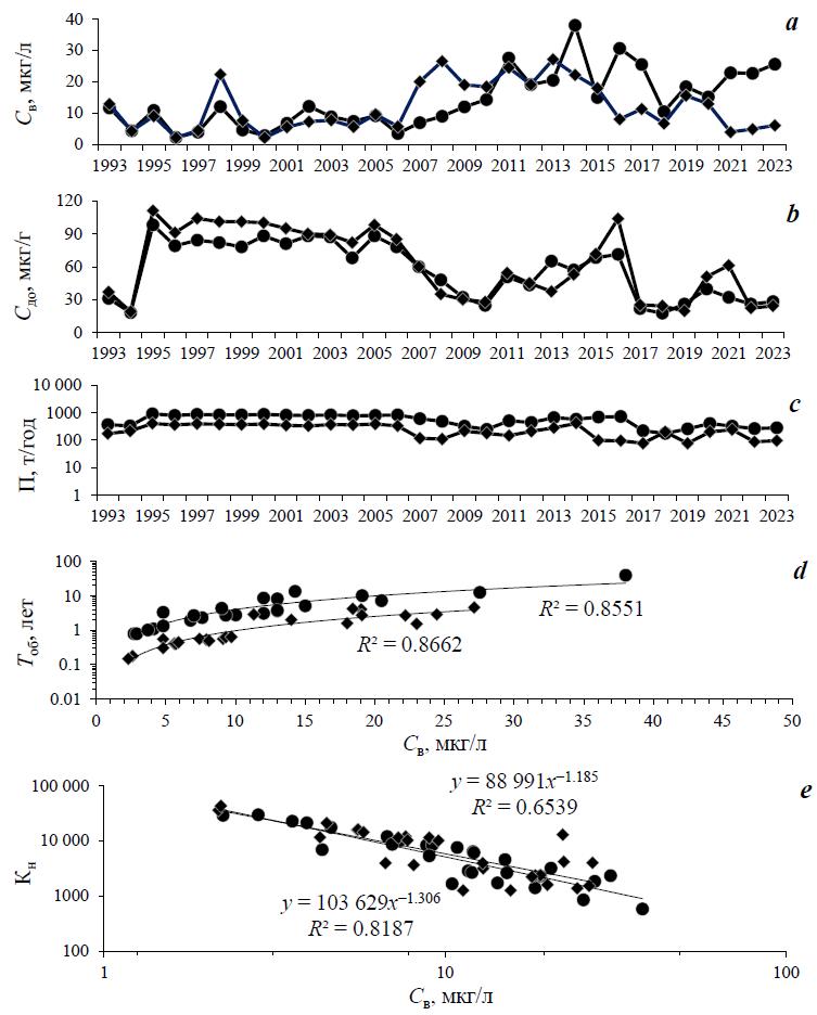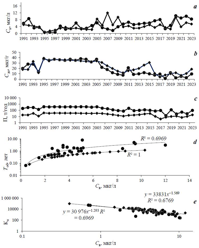 where S is area of the water area under consideration, km2; vsed is sedimentation rate, g×m−2·year−1; Cw is metal concentration in water, µg/L; a is coefficient which corresponds to adsorption and depends on the nature of adsorbent and adsorbate, it is determined graphically (highlighted in bold in the equation of the power function in Figs. 2, е and 3, е); n is power exponent.
