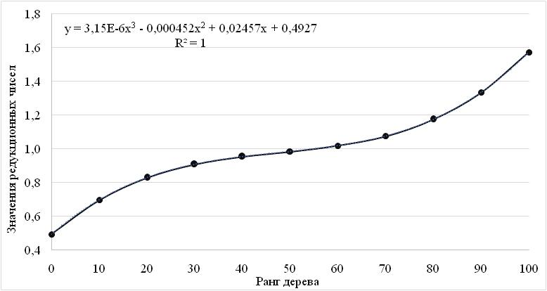 Метод Шиффеля предполагает использование значений отдельных особей, что может приводить к ошибкам. Более точное вычисление редукционных чисел возможно с использованием среднего внутри групп рангов [13]. Вычисленные на этой основе редукционные числа использованы для создания следующей модели изменения редукционных чисел диаметров от ранга дерева