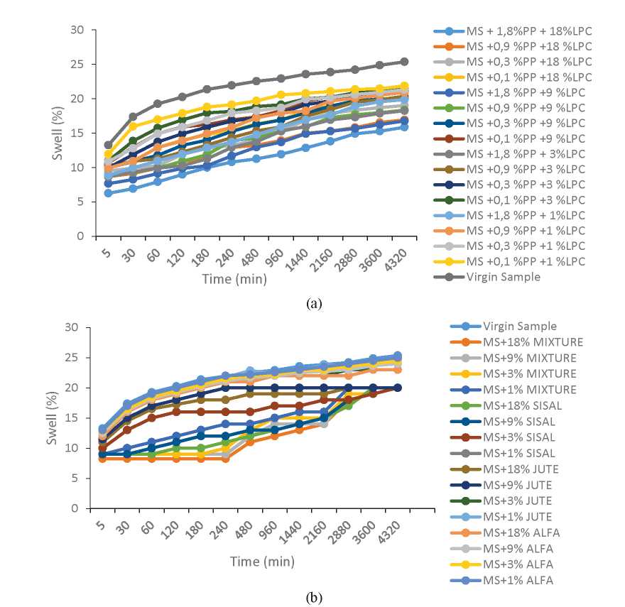 - Higher percentage: despite having higher percentages of plant fibers in the mixture (18%), their swelling reduction effect was not as significant as that of PP fiber with LPC. This implies that plant fibers alone may not provide as robust reinforcement against swelling.