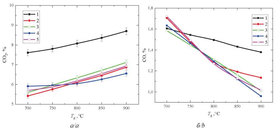 Рис. 5. Концентрации CO₂ (a) и CO (б) при варьировании температуры газовоздушной среды: 1 – № 1; 2 – № 2; 3 – № 3; 4 – № 4; 5 – № 5