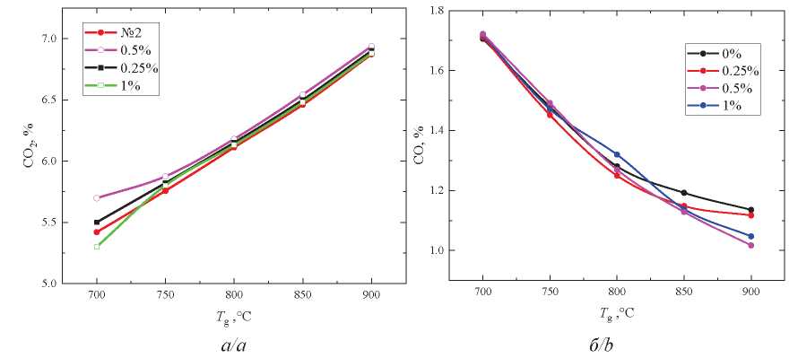 На рис. 7, а представлены зависимости содержания СО₂ от температуры газовоздушной среды при горении водомазутных эмульсий при варьировании концентрации присадки ИОН М. Показано, что при варьировании присадки ИОН М в размере 0,25, 0,5, 1 % возрастает количество СО₂ на 0,9, 2,1 и 0,1 %, соответственно, относительно состава № 2 при Tg=700–900 °С. На рис. 7, б представлена зависимость содержания оксида углерода при варьировании концентрации присадки ИОН М. Показано, что при горении водомазутной эмульсии при варьировании присадки ИОН М в размере 0,25, 0,5, 1 % снижаются выбросы СО на 0,5, 2,7 и 1,1 %, соответственно, относительно состава № 2 при Tg=700–900 °С. Таким образом увеличение концентрации присадки до 1 % к водомазутному топливу оказывает несущественное влияние на антропогенные выбросы.