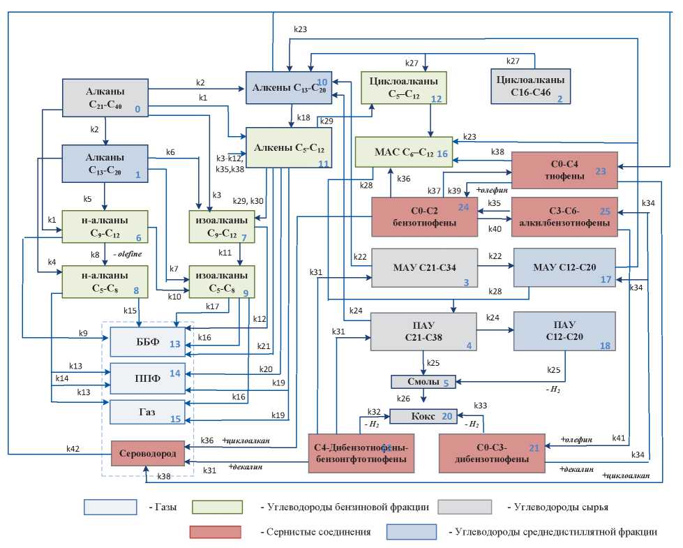 На основании результатов экспериментального исследования состава сырья и продуктов процесса разработана новая реакционная схема процесса каталитического крекинга (рис. 2), отличающаяся от разработанной ранее [18] учетом химических превращений компонентов высокомолекулярных и среднедистиллятных нефтяных фракций и основных классов сернистых соединений. Тем самым обеспечивается чувствительность модели к составу вовлекаемых в переработку компонентов и смесевого сырья.