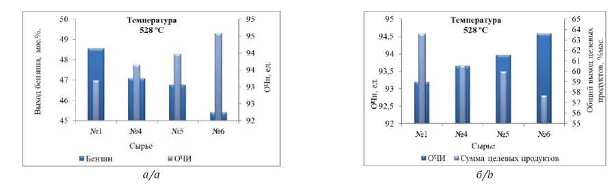 Рис. 6. Влияние изменений в составе сырья на сумму целевых продуктов и ОЧи бензина (а) и содержание кокса и активность катализатора (б)