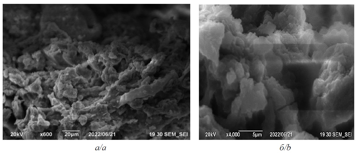 Применение электронной микроскопии позволяет оценить структуру и наличие микро-, мезо- и макропор в исследуемых образцах сорбента. На рис. 3 представлены результаты микроскопической съемки поверхности сорбента (в 600 и 4000 раз), полученного из вымороженных осадков шлам-лигнина ОАО «Байкальский ЦБК».