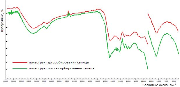 Для установления типов связей сорбента с извлекаемыми металлами использовался метод ИК-спектроскопии на приборе IR Prestige-21 (Shimadzu, Япония), который является первым ИК-Фурье спектрометром, позволяющим работать не только в классической средней ИК-области (MIR), но и в ближней (NIR) и дальней (FIR) областях. Образцы для ИК-спектроскопии готовились следующим образом: растертый в агатовой ступке полученный сорбент (0,5 г) обрабатывался насыщенным раствором нитрата свинца с концентрацией 30 г/100 мл и выдерживался 24 часа, затем отфильтровывался, промывался водой, высушивался при 105 °С и анализировался на ИК-спектрометре. ИК-спектры образцов регистрировались с помощью приставки НПВО (нарушенного полного внутреннего отражения) с кристаллом из селенида цинка.