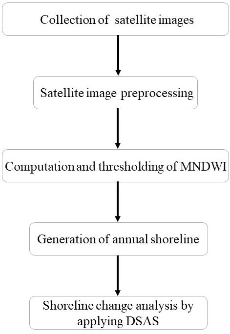 This method has the advantage of detecting water in areas without built-up soil. However, the results, when using NDWI, are often confused between construction ground and water surface. In order to overcome the above-mentioned shortcomings of NDWI, the author in introduced the nodification of normalized difference water index, MNDWI by shortwave infrared channel – SWIR (band 6) replaces the NIR channel used in the NDWI formula. In this study, Xu also demonstrated the superiority of MNDWI over NDWI by testing both formulations on three different environments, namely the coastal area of Xiamen City, Bayi Lake and Min River of China and gave results with accuracy up to 99% for all three environments. Xu's modified water difference index has the advantage of extracting water in areas with mainly built-up soil or alluvial soils, but has weaknesses in detecting water bodies with low water content high alluvial concentrations and in the waters surrounding the port [14–18]. Therefore, this study used the MNDWI index for shoreline extraction. The overall methodology is summarized in Fig. 3.