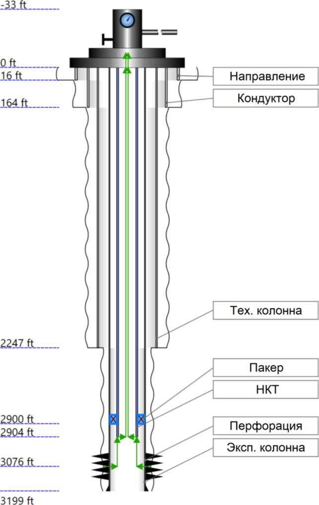 Конструкция скважины № 12 задана в соответствии с технологической схемой разработки месторождения. Модель скважины представлена на рис. 1. Зелёным цветом указан путь движения флюида, отметки в футах соответствуют значениям спуска обсадных колонн, НКТ и пакера.