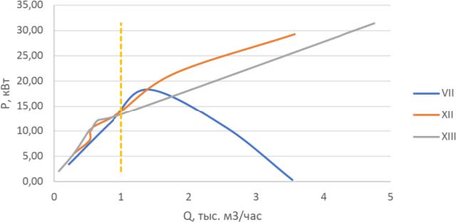 Очевидно, что на необходимую мощность греющей линии оказывает влияние дебит газа и требуемое повышение температуры. Перегиб для скважины № 12 (пласт VII) можно объяснить за счёт меньших значений DТ. Также при существующем технологическом режиме эксплуатации скважин (1 тыс. м3/ч) суммарная мощность для всех четырёх скважин составляет 55,26 кВт, установка турбодетандера будет выбираться из значения данной величины.