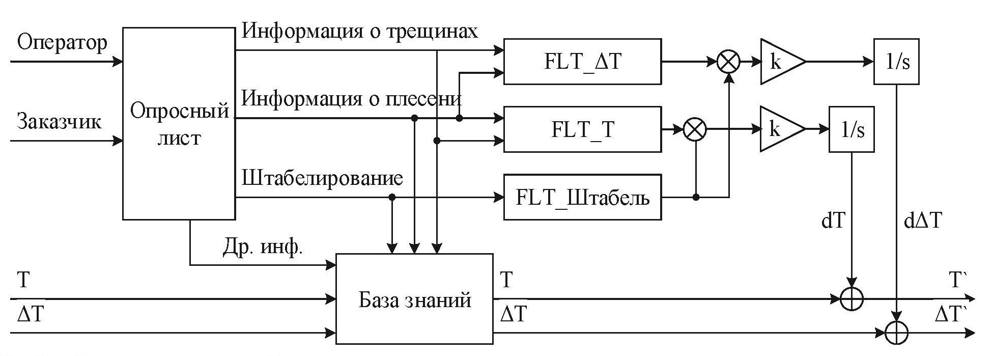 На рис. 2 представлена структурная схема работы предлагаемого алгоритма. Рассмотрим назначение основных блоков, входящих в состав алгоритма. После проведенной сушки оператор и заказчик заполняют опросный лист о результатах сушки. Их ответы да/нет, много/мало, фото и пр. записываются в базу знаний, также в нее сохраняются величины температур, значения психрометрической разности предыдущего режима. Информация из опросного листа о том, как выполнено штабелирование, какое количество треснувших и пораженных плесенью досок было получено в результате сушки, поступает на блоки нечеткой логики. В блоках FLT_T и FLT_ΔT и FLT_Штабель происходит фаззификация данных опросного листа. Необходимым условием правильной работы алгоритма является запрет обработки и расчета параметров нового режима при неправильно выполненном штабелировании. Это осуществляется перемножением сигналов блоков FLT_T и FLT_ΔT с FLT_Штабель. Далее сигнал усиливается, проходит через интегратор, и полученные величины изменения режима (dТ, dΔТ) суммируются с исходными, в результате чего создаются параметры нового режима (Т`, ΔТ`). Структура данного алгоритма одинакова для всех трех этапов сушки. Другими словами, для каждого из этапов будут рассчитываться индивидуальные, новые параметры режима при использовании различных коэффициентов усиления. Пример работы алгоритма рассматривается далее в статье.