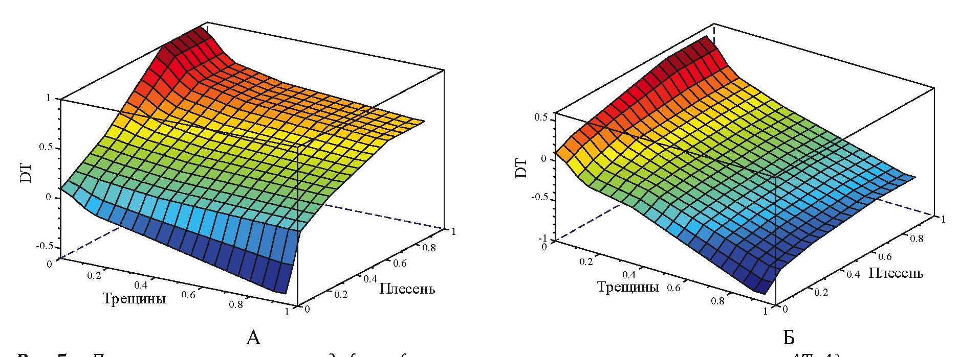Они позволяют распространить решения эксперта на всю область изменения параметров режима. На основании криволинейных функций можно определить, как необходимо изменить величину психрометрической разности следующей сушки для увеличения ее быстродействия при любом соотношении количества деформированных и пораженных плесенью досок. Аналогичным образом получаются поверхности изменения параметра температуры. Поверхности являются функциями, определяющими направление и амплитуду изменения основных параметров Т и ΔТ.