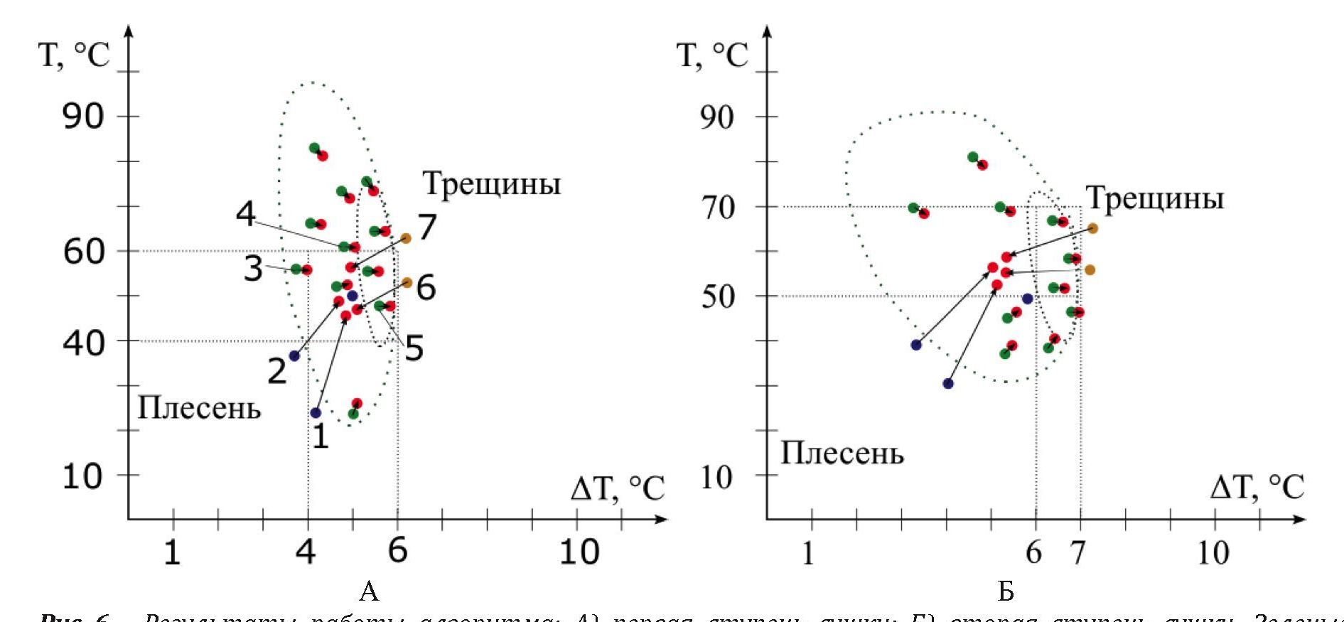 Рис. 6. Результаты работы алгоритма: А) первая ступень сушки; Б) вторая ступень сушки. Зеленые точки – успешные сушки, оранжевые – сушки с треснувшими досками, синие – пораженные плесенью, красные – точки, предложенные алгоритмом