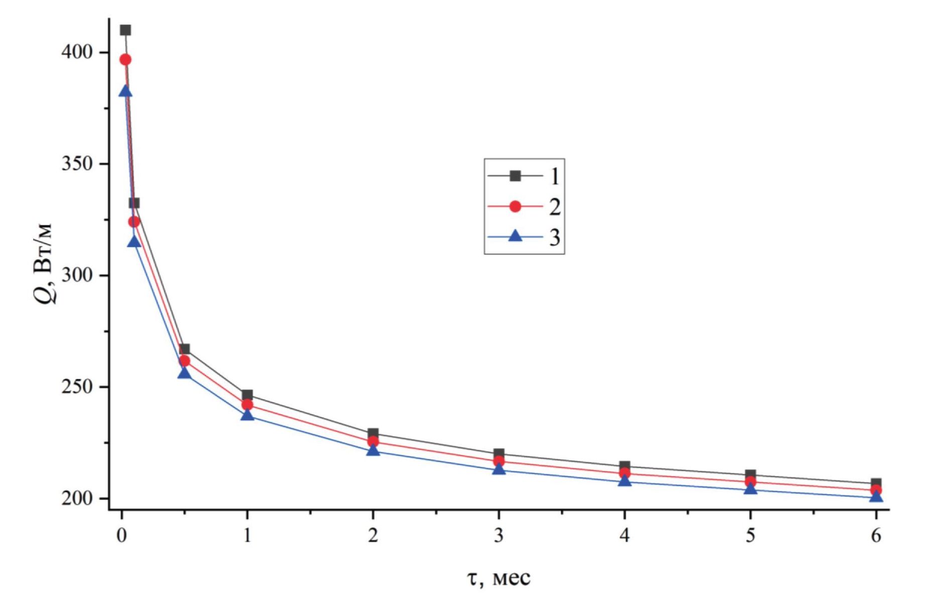 Рис. 3 в качестве примера иллюстрирует типичную картину снижения теплопритоков Q к ГТ во время эксплуатации при фиксированной скорости движения энергоносителя по кольцевому каналу (V=1,0 м/с), различных значениях объемной влажности песчаной засыпки W и учете испарения влаги в засыпке.