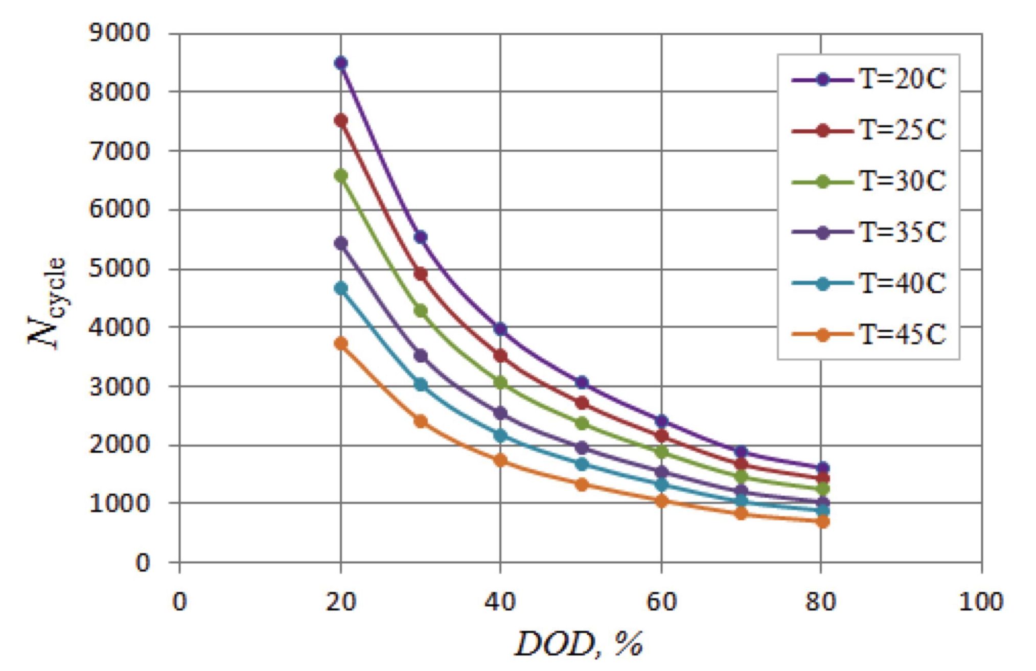 Результаты многочисленных исследований показали, что основными стресс-факторами, влияющими на срок жизни АКБ, являются температура T, глубина разряда DOD (Depth of Discharge) и число рабочих циклов Ncycle. Большинство производителей АКБ в паспортах технической спецификации предоставляют характеристики их срока службы, выраженные в числе рабочих циклов, в зависимости от глубины разряда Ncycle=f(DOD) и температуры Ncycle=f(T), например, [27].
