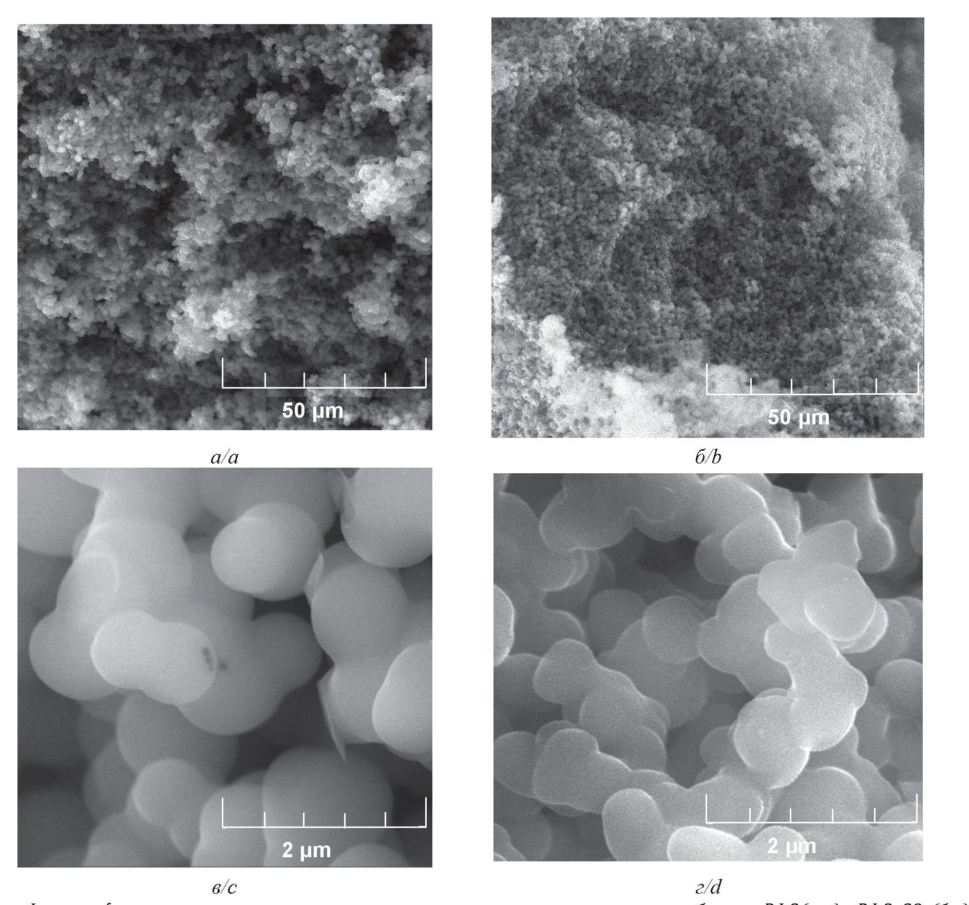 Рис. 1. Фотографии, полученные при помощи сканирующего электронного микроскопа, образцов РФС (a, в) и РФС+CO2 (б, г)