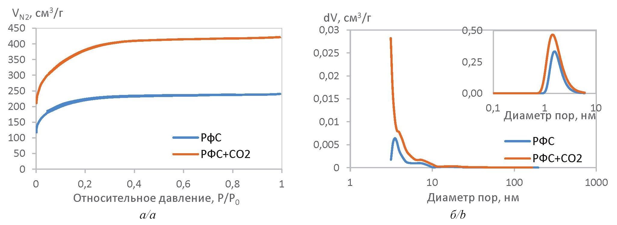 Таблица 1. Характеристики пористости и поверхности РФС и РФС+CO2