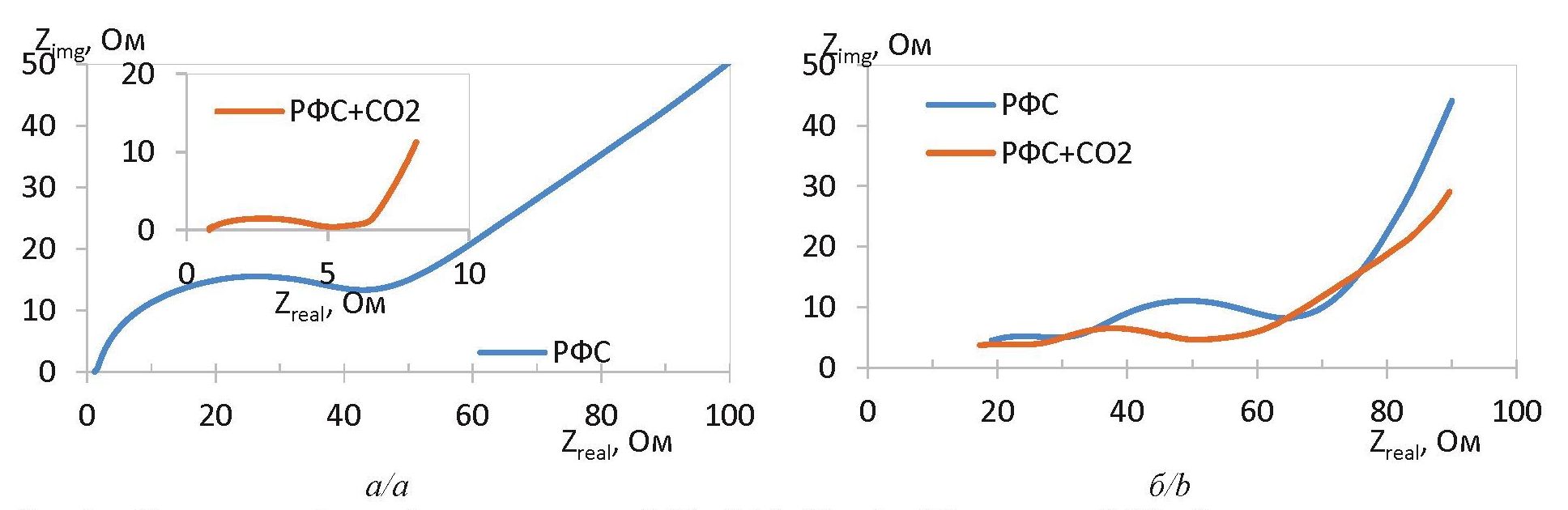 Рис. 5. Кривые импедансной спектроскопии РФС и РФС+CO2: a) в 1М растворе H2SO4; б) в органическом электролите