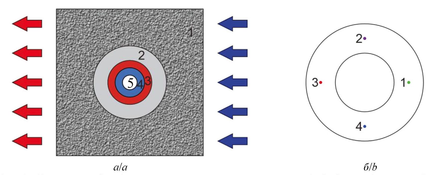 Рис. 1. Геометрия модели (горизонтальное сечение скважины и пласта): a) области: 1 – пресноводный горизонт; 2 – цементное кольцо; 3 – металлическая обсадная колонна; 4 – жидкость в обсадной колонне; 5 – индукционный нагреватель; б) точки 1–4 – регистрации температуры на внутренней поверхности обсадной колонны