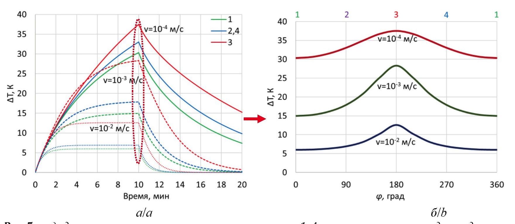 Рис. 5. а) динамика температуры колонны в точках 1–4 при различном расходе жидкости в пресноводном горизонте и негерметичном цементном кольце; б) азимутальное распределение температуры в колонне через 10 мин после включения индукционного нагревателя (сплошная линия – скорость фильтрации в пресноводном горизонте 10–4 м/c, штриховая – 10–3 м/c, точки – 10–2 м/c)