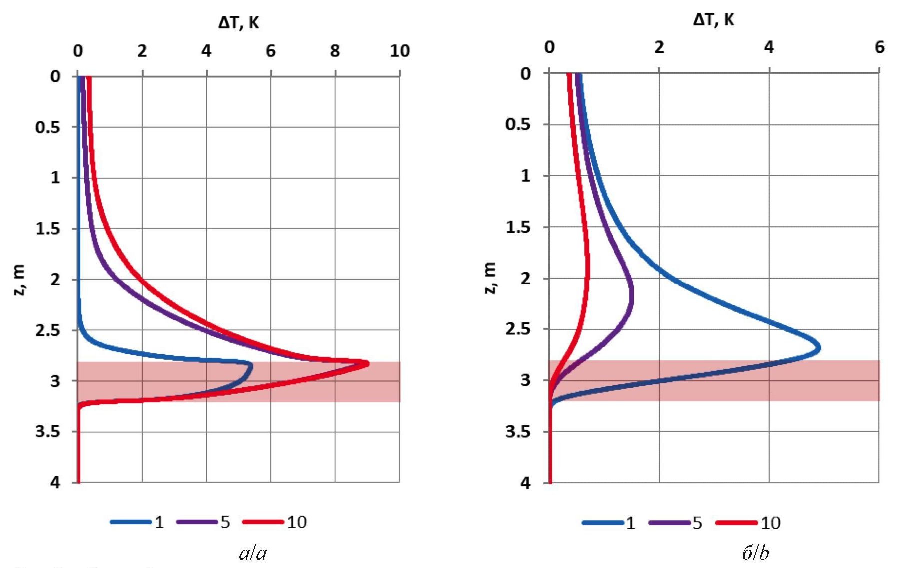 При наличии негерметичности цементного кольца (трещин и каналов в цементе) фильтрационный поток в пласте может напрямую контактировать с обсадной колонной, в этом случае теплообмен интенсифицируется за счет конвекции, в результате чувствительность температуры колонны к потоку в пресноводном горизонте возрастает. При увеличении скорости потока в пресноводном горизонте с 10–4 до 10–2 м/с максимальный разогрев колонны в точке 1 снижается с 30,3 до 6,0 К (на 24,3 К), в точке 3 – с 37,5 до 12,6 К (на 24,9 К). Максимальная разница температур между точками 1–4 при негерметичном цементном кольце также существенно возрастает, например, при скорости потока 10–4 м/с она достигает 7,2 К, при скорости 10–3 м/с – 13,4 К, при скорости 10–2 м/с – 6,6 К. Поскольку теплоперенос осуществляется в направлении движения фильтрационного потока в пресноводном горизонте, максимальная температура достигается в точке 3, минимальная – в точке 1.