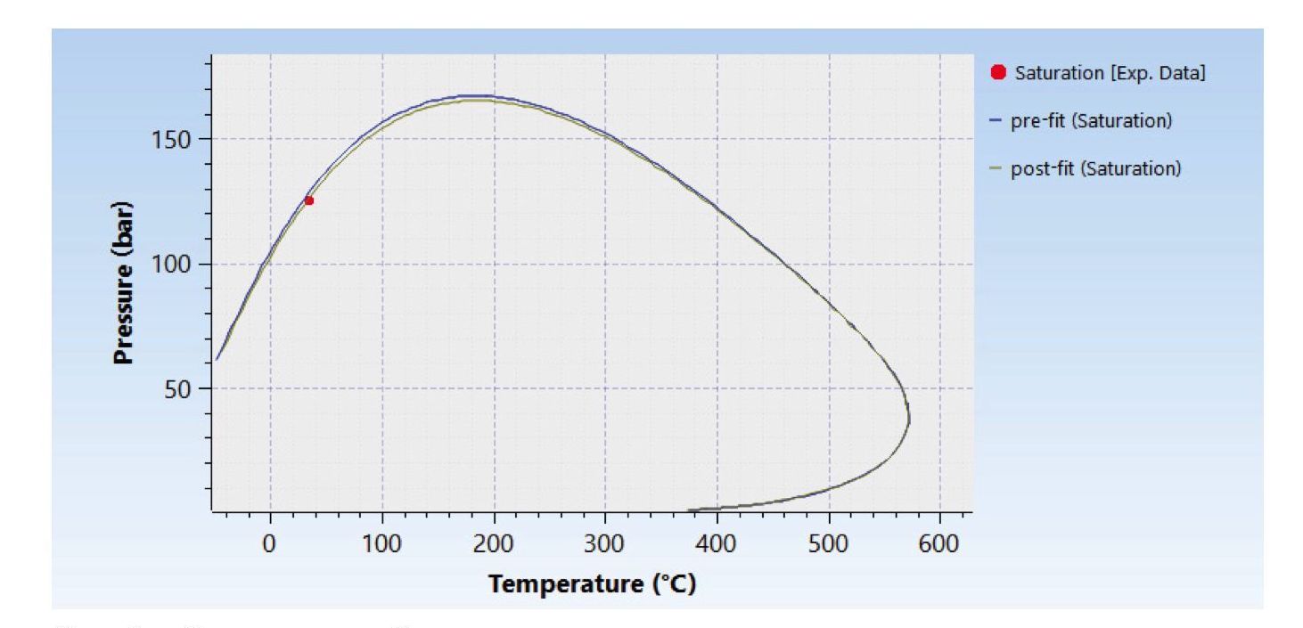 Для созданной модели нефти скорректировано давление насыщения до принятого значения 12,56 МПа (при температуре 34 °С). Зависимость давления насыщения от температуры для модели флюида представлена на рис. 1.